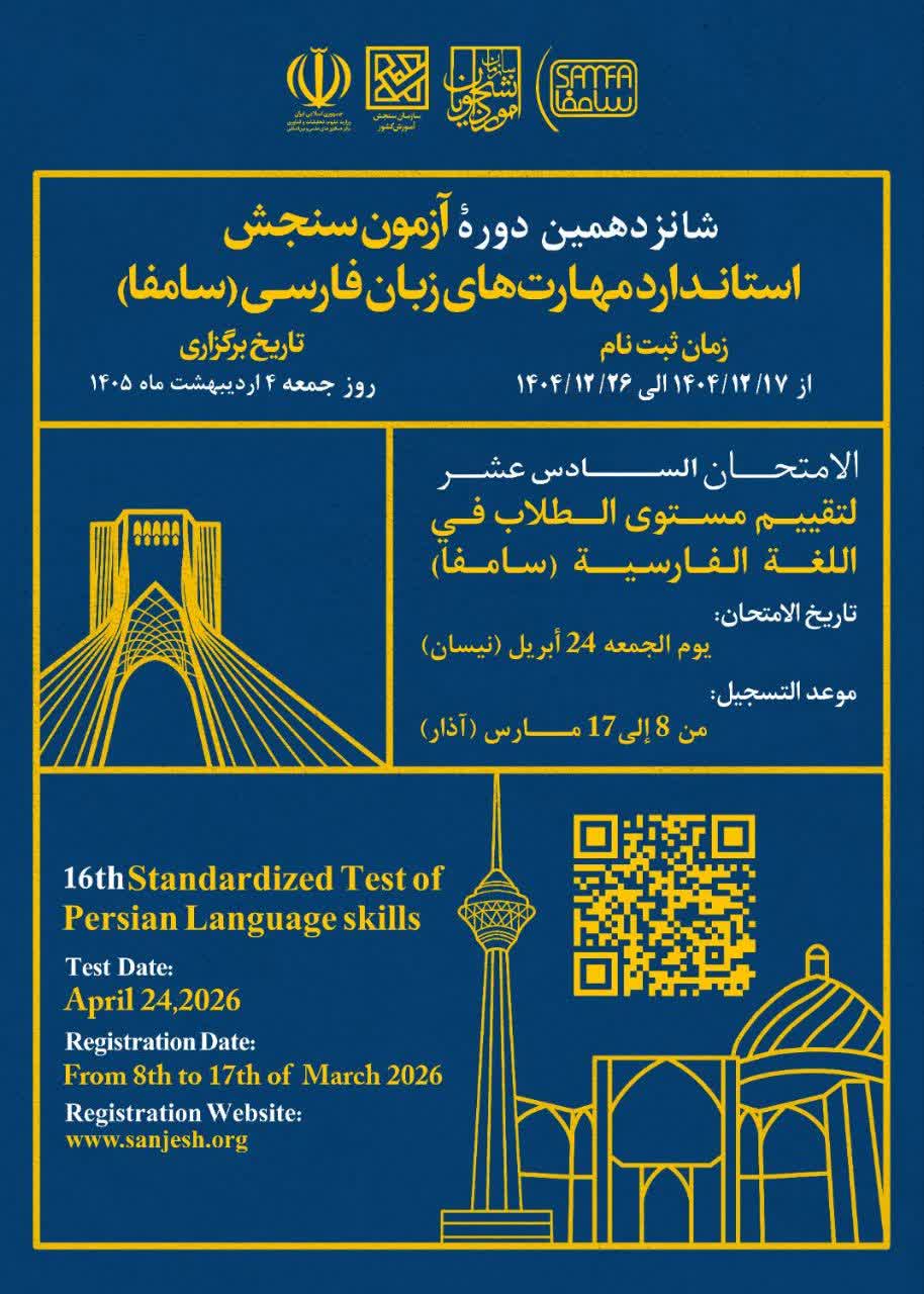 ثبت نام شانزدهمین آزمون سنجش مهارت های زبان فارسی (سامفا) از 17 تا 26 اسفند ماه 1404 از طریق سایت سازمان سنجش آموزش کشور برگزار خواهد شد. موعد برگزاری این آزمون 4 اردیبهشت ماه 1405 میباشد.