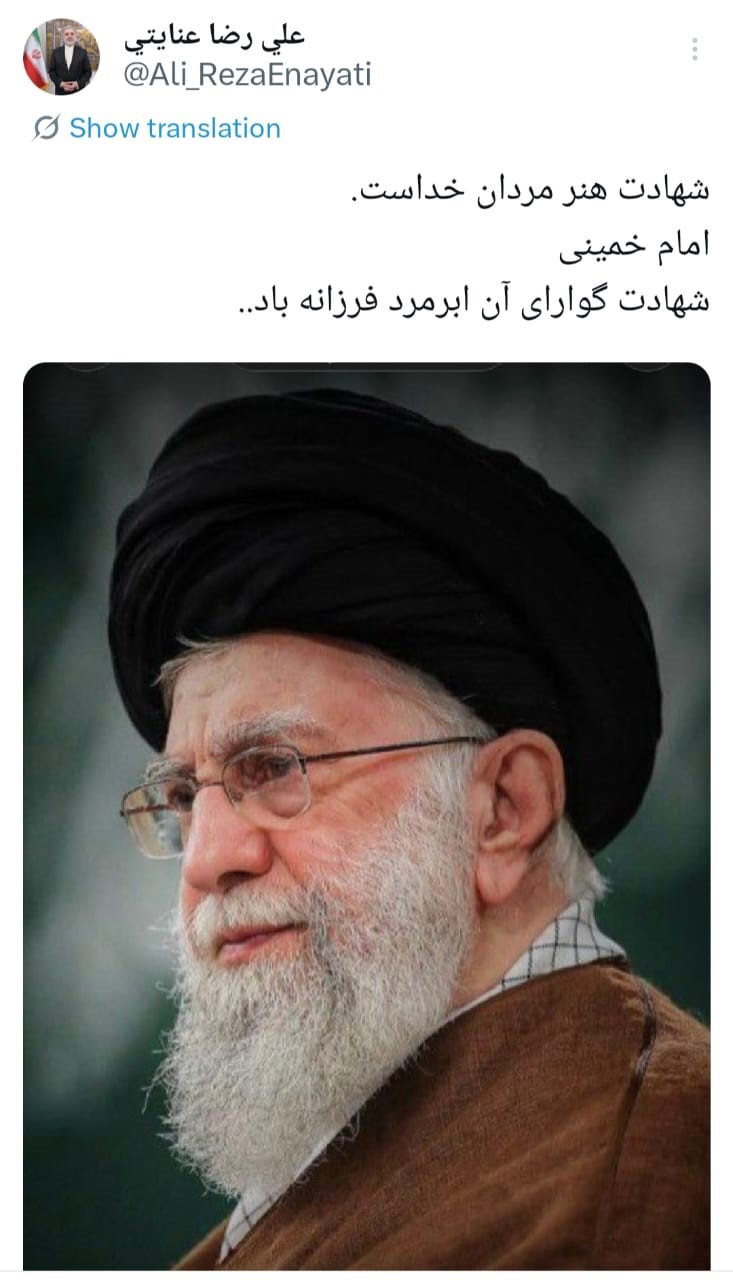 در پی شهادت حضرت آیت الله سید علی خامنه ای، رهبر معظم جمهوری اسلامی ایران، علیرضا عنایتی سفیر کشورمان در عربستان سعودی، پیامی در سکوی ایکس منتشر کرد.